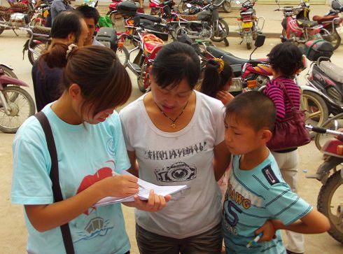 本次户外调研活动的主要对象是妇女和儿童,以发放调查问卷的形式开展。本日正值冯原中心小学举行结业典礼之日,全校1000余人到校,校门口人来人往,停满了学生家长的各种车辆。队员们热情地向来往人群发放关于“留守妇女儿童”的宣传单,回答家长的各种问题。其中,我们发现了不少具有典型特征的留守儿童,了解到他们家庭的基本情况,并且确定了几个家访的对象,准备进行点对点关爱活动。