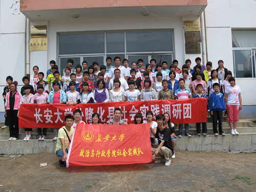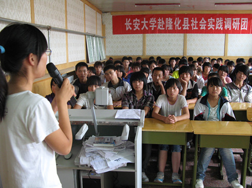 上午9时,实践队一行八人抵达大坝中学,受到了校长和主任的热情接待。在校领导向队员们介绍了学校的教学状况和升学率后,实践队开始了校方预先安排好的与七、八年级的同学的交流会。交流会分为五个环节,为主任寄语、校友访谈、奋斗之路、五彩生活和热爱生命。首先主任代表全校师生对长安大学赴隆化县爱国主义基地调研团的到来表示热烈的欢迎,并对在场的学生提出了认真听讲、虚心求教的要求。接下来的是“校友访谈”,是由曾雪、聂广阔两个从大坝中学走出去的同学讲述他们的经历、心得。曾经,他们就读于这所乡中;现今,他们身在全国重点大学。没有什么比这种“现身说法”更具感染力了,在场的学生无不倍受鼓舞。然后是“我的奋斗之路”,由队员李秀华、尹傲、刘厦分别讲述了自己的奋斗历程,并部分的介绍了中学时期的学习方法。同学们听的十分认真,他们认识到了没有人可以不劳而获,每个人的成功都是要经过自我拼搏的。接下来的环节是“精彩的大学生活”,程明远、张永凤两位同学向大家讲述了他们的大学趣事,好像他们讲述的不是事实,而是勾勒出了一幅绚丽画卷,孩子们听得如醉如痴,无不欣然向往。最后是“热爱生命”,队长曾雪动之以情晓之以理,以事实为据,向大坝中学的孩子们讲述了生命的可贵,唤起了大家热爱生活、珍惜生命的意识。