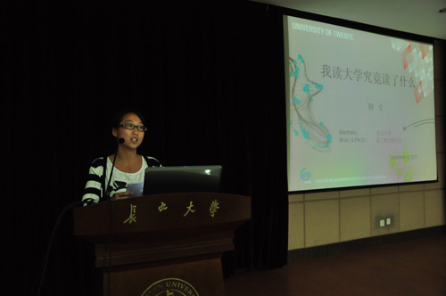 然后,荆莹同学与学院2011级全体新生进行了题为“我读大学究竟读了什么”的交流会。荆莹同学通过自己在国内、国外的学习经历来分享自己六年学习、生活的经验。她强调在大学生活中要充分夯实自己的专业知识,了解就业现状,学好英语。此外,还要珍惜生活、热爱生活,积极展现自己的才能,丰富自己的阅历。最后,荆莹同学希望同学们充分利用大学的时光,为成为国家栋梁、世界精英做好准备。