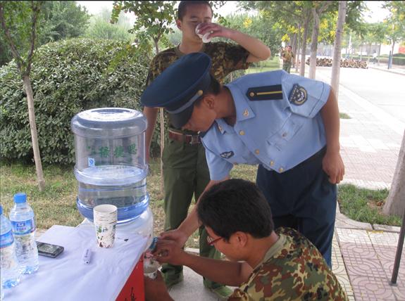 军训伊始,为帮助新生更快更好的适应军训生活,我院团委学生会于2日至4日在军训场地处设点,在该点免费提供饮用水、开水,并为身体不适同学准备了感冒药,解暑药等常用药物。休息期间,同学们纷纷前来饮水,我院学生会工作人员耐心服务,并为新生加油打气,鼓励他们以优秀的成绩完成军训。此举得到了教官和同学们的一致好评。