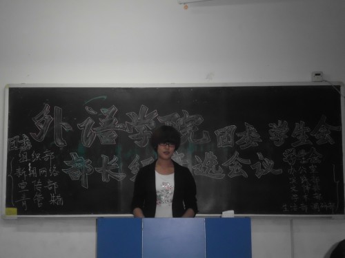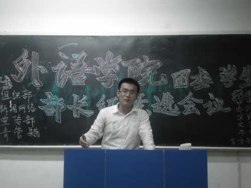 2011年9月7日晚19点,外语学院团委学生会部长级竞选会议在修远1304教室顺利举行。参加本次大会的有外语学院辅导员黄钰杰,学生会主席团成员和参与竞选的同学们。