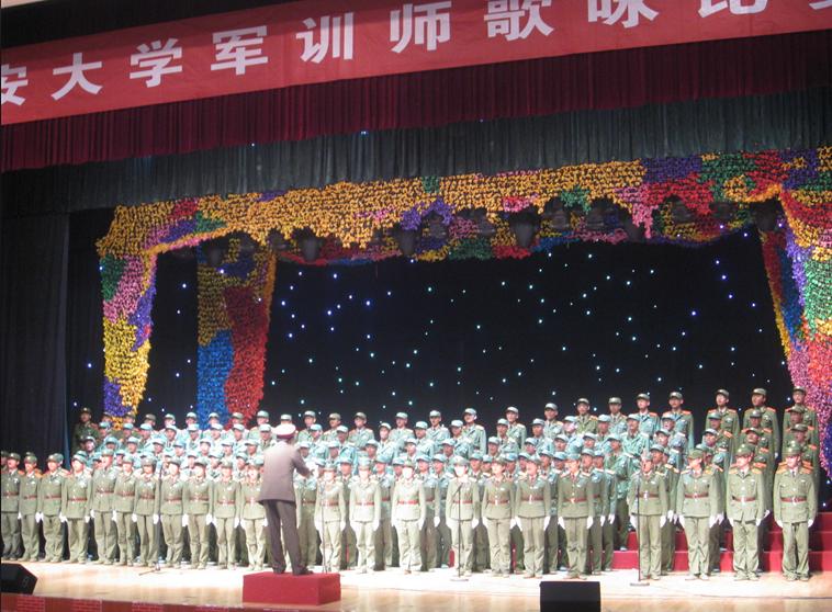 2011年9月11日晚,长安大学军训师歌咏比赛在朝辉大学生活动中心一楼举行。共有十支队伍参加了此次比赛,工程机械学院新生合唱队凭借对《祖国不会忘记》和《中国人民解放军军歌》的出色演绎,脱颖而出,荣获二等奖。