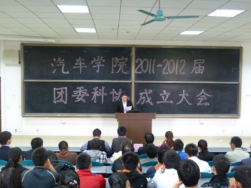 2011年10月14日12时30分,长安大学2011-2012届汽车学院团委科技协会成立大会于WT1204教室隆重举行,团委副书记易磊老师,09级辅导员王莹老师,10级辅导员滑海宁老师,11级辅导员王抢老师以及汽车学院团委科技协会全体成员参加了本次会议。