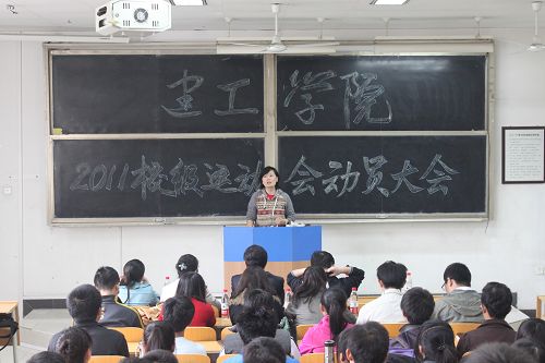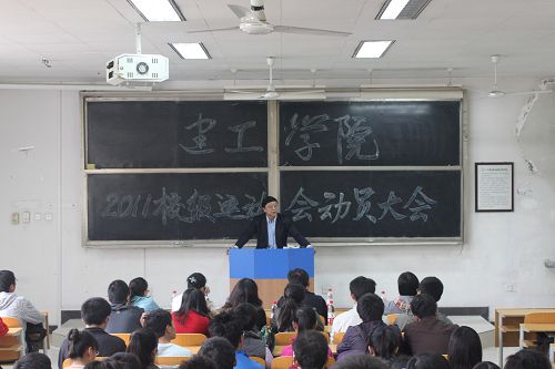 2011年秋季运动会临近,为提高运动员积极性,统筹安排活动,10月12日中午12:30,建工学院于修远3101教室召开了2011年校级运动会动员大会,出席动员大会的有建工学院党委副书记刘世良老师,团委书记王树莹老师,团委副书记黄小乐老师,各级辅导员,运动员代表及各项目负责人。