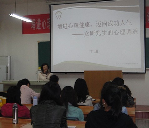 10月20日下午,经济与管理学院特邀我校心理健康咨询中心主任兼学生就业与发展服务中心副主任丁珊老师为新生举办“增进心理健康,迈向成功人生”讲座,全体2011级女研究生聆听讲座。