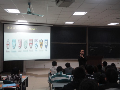 2011年10月25日晚上7:00,外语学院在图书馆1102教室成功举办了“美国文化面面观”专题讲座。此次讲座邀请到了思润外籍教师白金老师,各学院同学积极参加,讲座现场座无虚席,掌声不断。