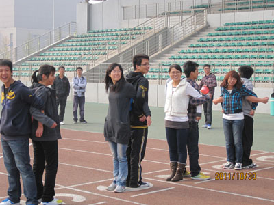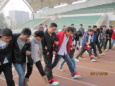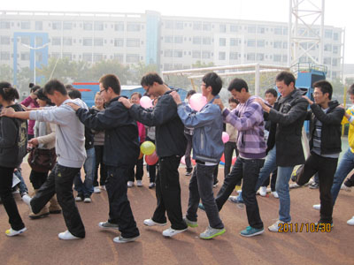 本次联谊活动由新闻部和宣传部组织策划,宣传部部长赵羚伊担任总指挥。30日一大早新闻部的干事们就提前到场进行活动准备事项。九点整,本团成员基本到齐,由赵羚伊宣布本次联谊活动正式开始。第一个游戏是“腿绑腿竞走”,在裁判宣布规则后,同学们各自抽签分组,然后用绳子将自己与队员的腿绑起来,每个小队6人,分为两个小组比赛,由封海洋计时,成绩优秀者有奖,差者“罚之”。比赛开始了,大家喊着口号,一步一步往前踏,在比赛过程中出现了摔倒现象,但是大家都坚持完成了比赛,从中我们看到了大家的团队精神。第二个游戏是“背靠背运气球”,同学们两两一组,男女搭配进行比赛。比赛期间,有些气球落地了,有些气球爆掉了,一片欢声笑语,其乐融融。第三个游戏是“比手划脚猜词”同样是抽签分组。由裁判展示图片内容,一个队员看后用肢体语言展示,另外一位同学猜词,依次循环,同学们表演出的“嫦娥奔月、鸭子、螃蟹横走”等等更是逗乐了大家。