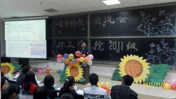 2011年11月2日晚7点,环工学院彩虹驿站与学生会学习部在图书馆东侧1101教室联合举办了以“举引航之灯,照成材之路”为主题的学习经验交流会。参加大会的有2011级辅导老师姚以亮,特邀演讲嘉宾有博士李培月,江超,硕士吴倩,及荣获国家奖学金的2009,2010级的优秀学生代表,校心协代表和环工学院彩虹驿站及学习部全体成员,以及11级全体新生。