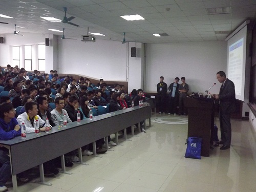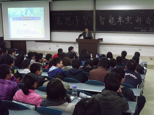 2011年11月5日 午时2点,由长安大学汽车学院团委科技协会举办科技节精品活动之一“飞思卡尔”智能车宣讲会于长安大学图书馆1101教室隆重召开。本次宣讲会由清华大学车辆工程系博士后、长安大学车辆工程副教授、硕士生导师、第六届全国大学生智能车竞赛西部赛区联系人韩毅副教授主讲,并特邀往届获奖团队成员出席,汽车学院广大学生积极参加了本次宣讲会。