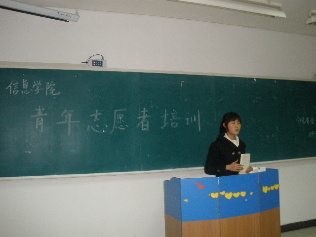 2011年11月7日星期一,信息学院青年志愿者总队于修远3405召开了第一次青年志愿者培训。参加本次培训的有志愿活动部部长刘梦雅,队务监理部部长拓恩琪,外联培训部部长杨晓光及信息学院的志愿者。