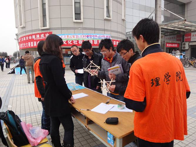 为了发扬长安大学“弘毅明德、笃学创新”的校训,彰显理学院的专业特色,培养大学生的实际动手能力和创新能力,我院大学生科技创新与创业协会决定举办长安大学第三届筷子模型承载力设计大赛。11月12日,我院科协在长安大学渭水校区树蕙园与滋兰苑广场正式开始宣传报名活动。