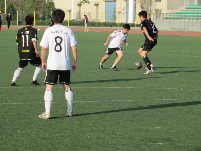 15:00,比赛正式开始。上半场刚开场,机械学院男足便占据场上优势,迅速控制住了局面,很快就取得了比分上的领先。在中场休息时,机械学院男足便取得了3:0的优势。下半场一开场,机械学院男足并利用一次反击打入一粒精彩的入球。面对大比分的优势,机械学院男足做出了人员调整。最终,机械学院和资源学院在比赛最后阶段各入两球,比分定格为6:2。