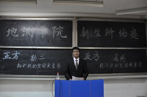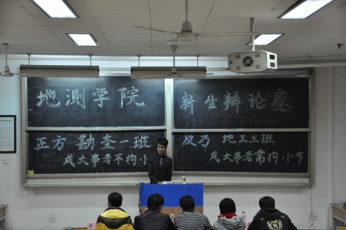 11月20日晚6:40,地测学院新生辩论赛第二场在修远教学楼举行。由初赛胜出的八支队伍分两组,共进行两轮比赛。本次辩论赛的评委由学院各社团组织的学生干部组成。