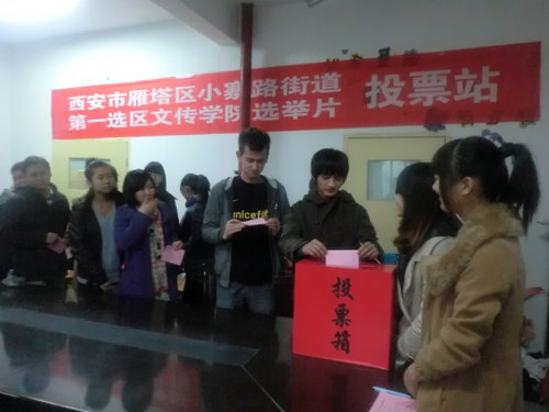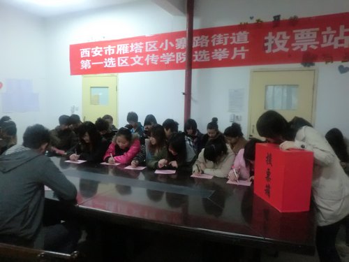 2011年11月21日,在雁塔区选举委员会的统一安排下,我校选民参加了雁塔区人大代表的选举。为积极响应号召,我院在14号楼一楼文传学院活动室设立了西安市雁塔区小寨路街道第一选区文传学院选举片投票站,进行选举投票。