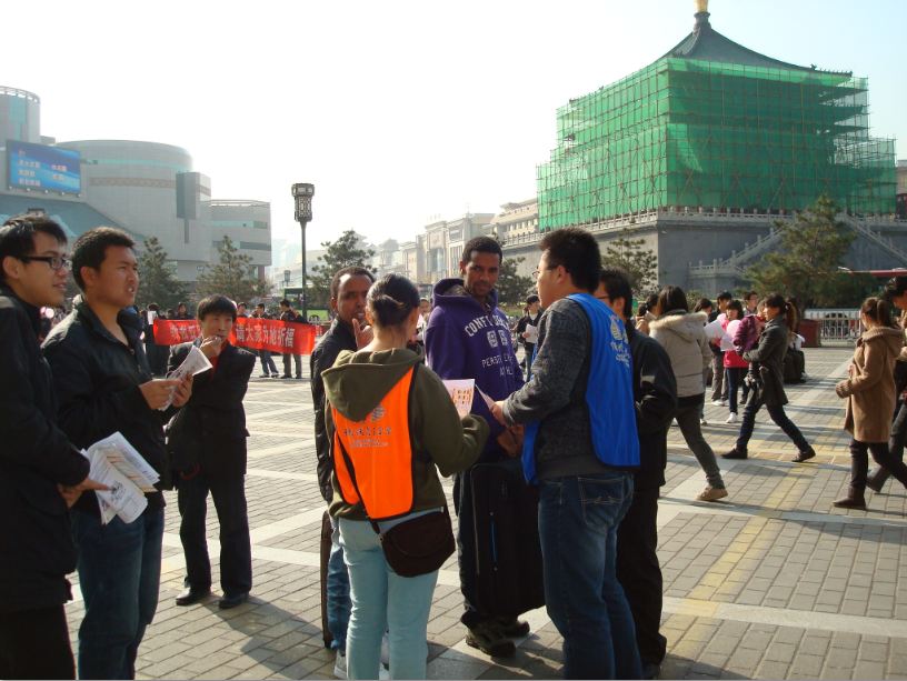 长安大学代表队由一名组长和九名优秀志愿者组成。当日早10点整,劝募比赛代表队准时到达预订地点东大街邮局站点开始一天激动又激烈的挑战赛。比赛场面精彩纷呈,各大电视台、报社进行了现场报道。在川流不息的东大街上,志愿者们怀揣着永恒不变的爱心与耐心积极主动地为市民介绍“爱心包裹”活动的信息。他们热情的相迎,礼貌的问候,流利的解说,诚恳的态度感动着行走的市民,温暖着初冬的寒风。虽然环境艰苦,遴选出的优秀志愿者们义无反顾地选择了坚持。他们,步及大街小巷;他们,穿梭林立商埠;他们,传递着爱心的接力棒!比赛中,志愿者们即使受到挫折也无怨无悔,一切为了什么,他们都懂——那山高水远的村落树林,那破旧不堪的桌椅黑板。