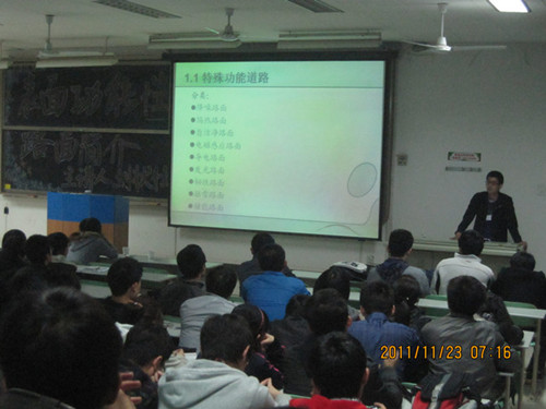 在一个小时的科普讲座中,刘状壮同学结合详细准确的数据表格向同学们介绍了低噪音路面、排水性路面、融雪路面、阻燃路面等多种新型表面功能性路面。在每一类新型路面的介绍中,刘状壮同学通过国内外的应用实例以及各种路面所独特的优缺点向同学们展示了高科技的迅猛发展以及中国道路材料的腾飞。在详细讲解后,他还向在座的所有同学提出了关于“还有哪些可应用于道路结构或道路材料中的特殊材料”及“材料学子如何将材料与道路工程技术相结合”的思考,将讲座气氛推向了高潮。在讲座末尾的提问环节,各位同学积极提问,与他在考研及新型材料等方面进行了交流。