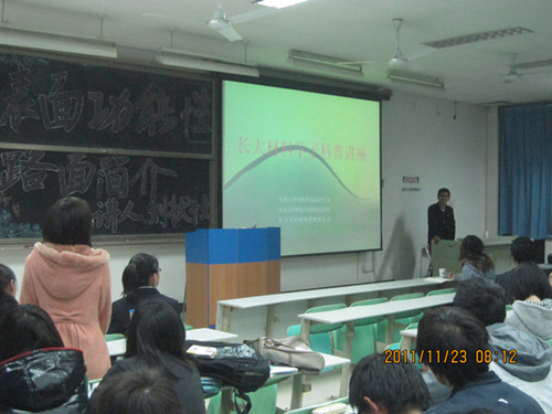 11月23日19时,由我院研究生会、研究生材料论坛协会和我院学生会联合举办的“长安大学材料学子科普讲座第三讲之特殊功能道路与材料科普讲座”在修远4304教室顺利举行。与会的有我院研究生会主席刘状壮同学、研究生材料论坛协会负责人张楠同学以及我院无机非金属材料专业和道路机场与工程材料专业200余人。
