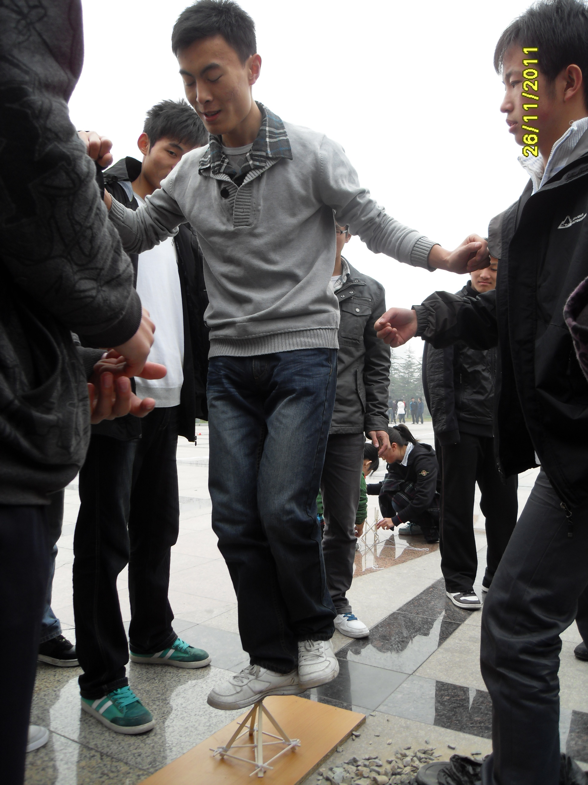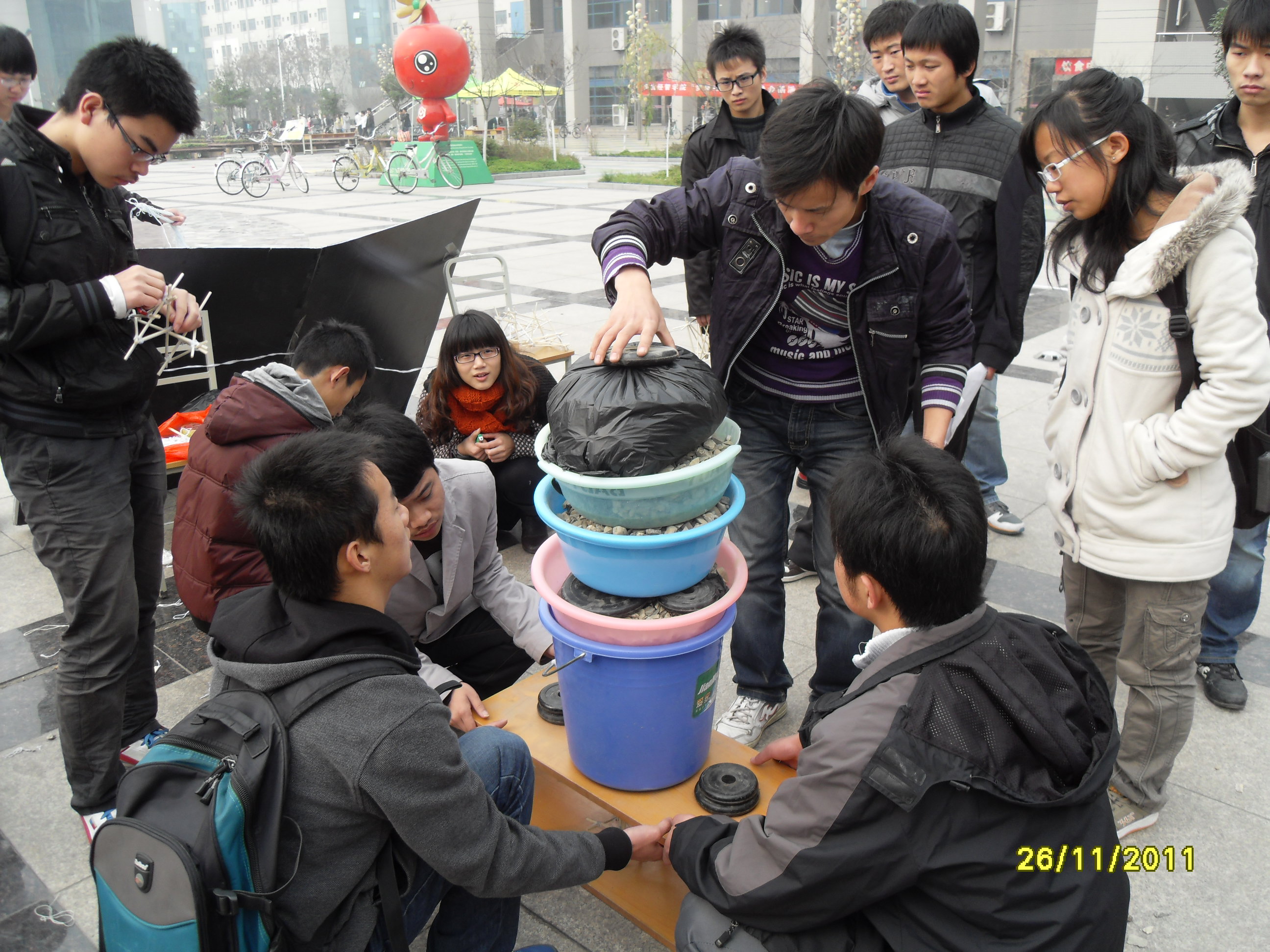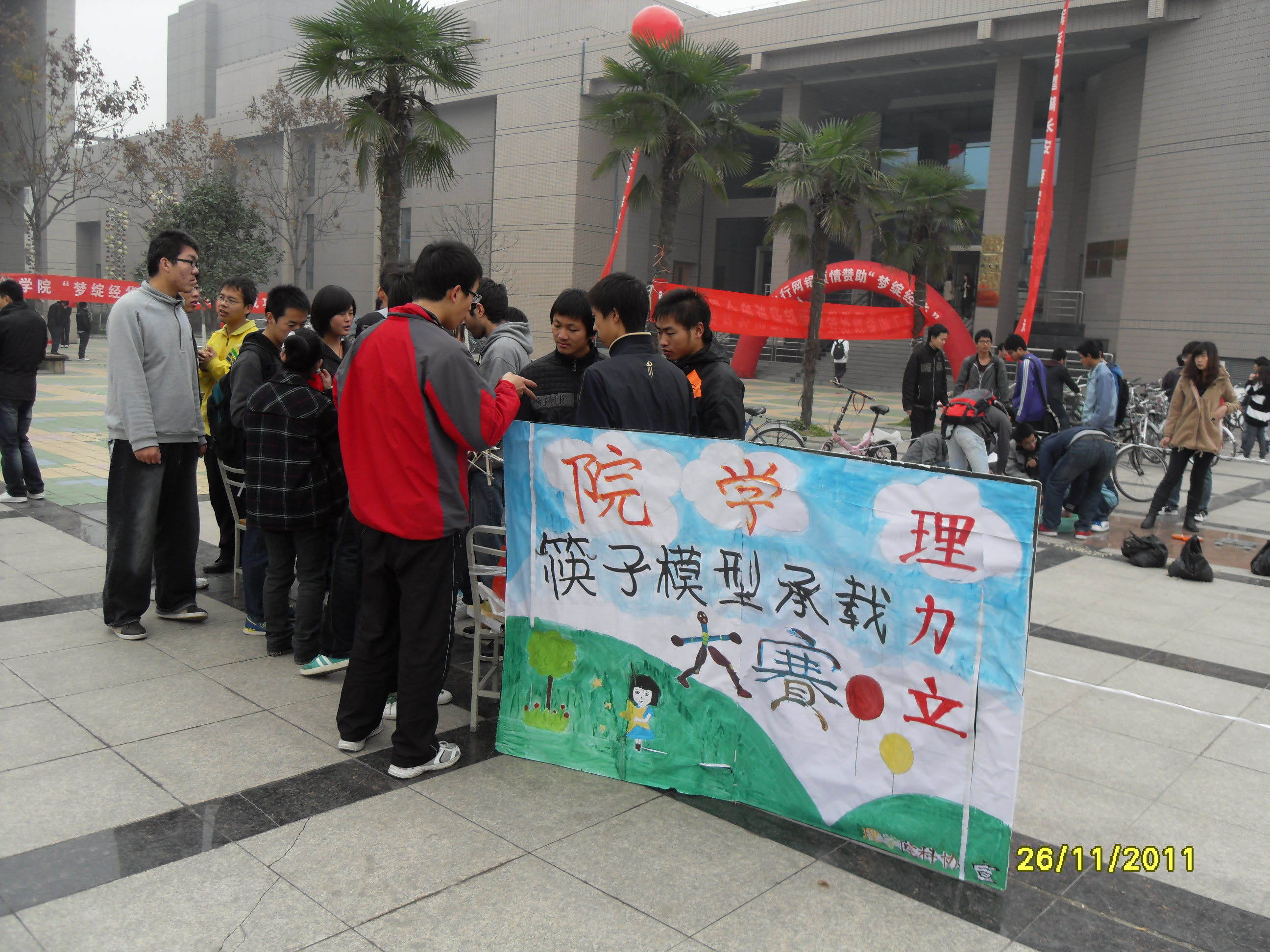 为了培养大学生科技创新意识,进一步提高他们社会实践与动手操作的能力,理学院大学生科技创新与创业协会承办了由共青团长安大学委员会主办的长安大学第三届筷子模型承载力设计大赛。在活动宣传与材料发放两个阶段成功完成的基础上,11月26日,在长安大学渭水校区树蕙院广场理学院科协成功举办筷子模型承载力测量大赛。参加此次活动的有130组参赛队及科协全体成员。