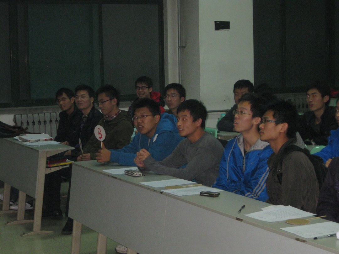 首先,三个主席赵国超、罗欢、杨均在三个比赛教室发言并宣布决赛正式开始,紧接着由主持人宣读比赛规则。宣读完毕,进入决赛第一环节必答阶段,各组选手沉着应战,战得骄人的成绩,随后进入抢答阶段,气氛也越来越活跃了,有一组选手在抢答时把抢答牌都扔上了天,但却没拿到答题权。抢答完毕,进入最后一环节风险题,这让所有选手心潮澎湃,特别是在4103这个教室,分数最低E组,在此次连选了个每个20分的风险题,最后全部答对,一举得了60分,全场掌声起立。三个环节进行完之后,选手们在4103教室集合,由主持人宣读比赛结果。
