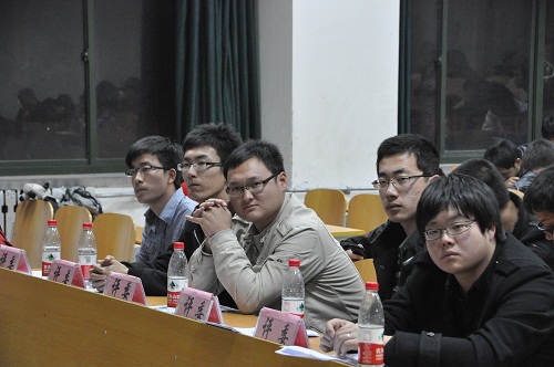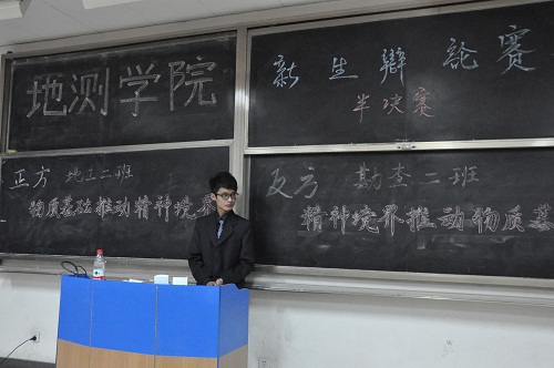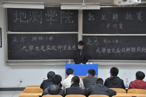 11月27日晚7:00,地测学院新生辩论赛半决赛在修远教学楼1102室准时举行,建工学院学生会主席董洁,环工学院学生会主席王瑶,哲思演讲协会副主席陈朝阳,我院学生会主席纵攀攀,我院科协原副主席秦克玉担任此次辩论赛的评委,本次辩论赛由大艺团主持部陈鹏主持。