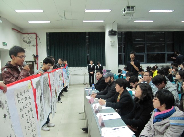 11月29日晚,长安大学第十一届大学生文化节“青葱校园,长大点滴” 百米书画接力大赛决赛评审工作在渭水校区明远1201教室隆重举行。本次大赛由共青团长安大学委员会主办,共青团工程机械学院委员会承办。校团委学生社团办主任龚少博老师、机械学院党委副书记杨密侠老师、团委书记朱武威老师、文传学院广告系副主任陆永祥老师、建筑学院副教授葛今老师和机械学院教师乔涵老师出席此次比赛并担任评委。
