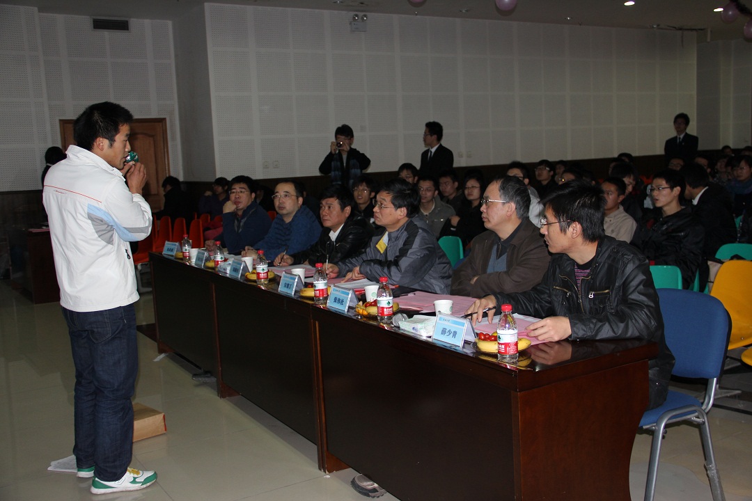 12月3日9:00,主持人宣布会议开始,并向大家介绍赛事概况,让大家对比赛流程有所了解。接着进入选手答辩环节,参赛选手们结合PPT向大家介绍自己作品的灵感来源、创新点、功能以及工作原理。参加本次大赛的作品达54件,种类繁多,功能各异,其中主要有娱乐健身器材、家用器材、生活用品、学习用品以及汽车设备等等。12:15答辩完毕,进入专家提问环节。专家们就作品的实用性,工作原理等方面提出了自己的疑问,然后由选手作进一步讲解。然后由宋绪丁教授对会议作总结。他指出了比赛对同学们的意义,帮助同学们解决场地,指导教师,费用等问题。最后进入颁奖环节。主持人宣布获奖名单,由老师及嘉宾为选手颁奖。