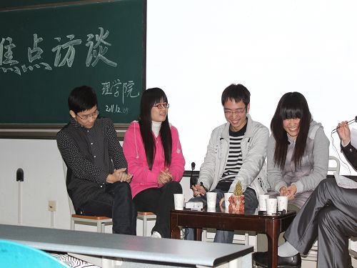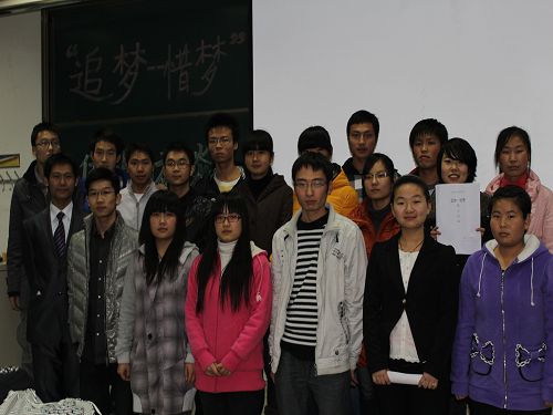 为了进一步加强学风建设,使大一新生对学习生活有更加理性的认识,12月15日晚7:00,我院在明远1205教室顺利举办了“追梦—惜梦”学习经验交流会。此次交流会邀请到了10级学习成绩优异的杨雯、蔡凤成、孙静静、茹栋四位同学与大一新生交流学习生活经验。2011级全体同学参加了此次交流会。交流会由叶柳青、孟宽主持。