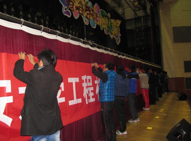 12月10日,工程机械学院2011年“青春当歌,织梦启航”迎新晚会第二次彩排在朝晖大学生活动中心如期举行。工程机械学院院团委书记朱武威老师,学生会主席李加庆亲临彩排现场指导工作。