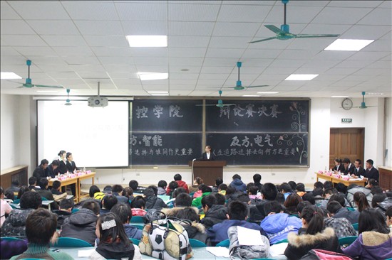 2011年12月13日晚7:30,长安大学渭水校区图文1101室热闹非凡,我院第三届辩论赛决赛在此隆重举行。本次比赛的评委及嘉宾有我院2010级辅导员赵磊,2011级辅导员张翔,团委副书记龚羽帆,团委学生会主席刘佳睿,哲思演讲与辩论协会主席陈朝阳。我院团委学生会学术部干事刘慧慧担任决赛主持人。会场上座无虚席,比赛气氛热烈高涨,掌声、叫好声此起彼伏,可谓是一场精彩绝伦的听觉盛宴。经过初赛和复赛,智能及电气两个专业代表队一路过关斩将,成功晋级决赛。辩论赛开始之际由主持人展示了辩论赛的历程,从初赛出茅庐的生涩争辩,到复赛中的努力拼搏和到现在游刃有余的精彩辩驳,使我们看到了辩手们的努力的汗水,成长的进步。