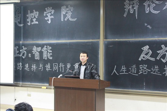 今天,辩论双方就“人生道路选择与谁同行还是选择去向何方更重要”这一辩题展开激烈辩论。正方11级智能专业代表队认为“人生道路选择与谁同行更重要”,而反方11级电气专业代表队则坚持“人生道路选择去向何方更重要”。双方辩手在立论、 攻辩环节中思路清晰,旁征博引,字字珠玑。在这淋漓尽致的演绎中,我们感受到的不仅是辩手们妙语连珠中对人生的思索,唇枪舌战中不凡的气度,更是他们激扬青春的风采。现场不时爆发出阵阵热烈的掌声。在随后进行的自由辩论环节中,双方展开更深层次的辩论,将比赛推向高潮。赛后,陈朝阳对本次比赛进行了点评并提出几点希望。随后赵磊老师做总结,他指出辩论赛就是要辩语言、辩思维,要会雄辩、思辨,而且要学好普通话。希望大家在以后的学习生活中抓住锻炼机会,多方位全面发展,努力提高自己,在校辩论赛上为我院争光,赛出水平。最后经过评委们的深思熟虑,反方四辩徐雪原成为本次决赛的最佳辩手,正方智能代表队成功夺得冠军。