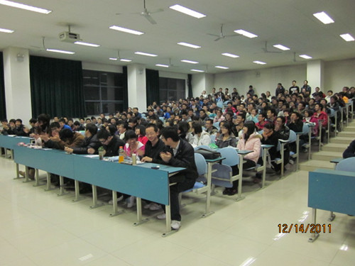 2011年12月14日 晚,资源学院在明远教学楼举行期末复习迎考经验交流暨考风考纪教育大会。参加此次交流会的有资源学院2011级辅导员老师査方勇、院学生会全体成员、优秀学生代表,以及2011级全体学生。