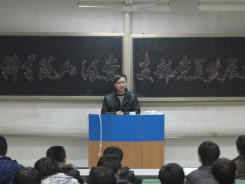 首先,王鹏飞同学简单介绍了会议流程,并说明此次会议主要是讨论陈光琦等19名发展对象的组织发展问题。接着,19名发展对象宣读了自己的入党志愿,并对自己在考察期内积极要求进步,要求加入党组织的思想动态和实际行动向党支部大会进行了具体汇报。随后,两名入党介绍人和其他群众分别对19名发展对象进行了评议。经支部大会正式党员举手表决全票通过,同意接收陈光琦等19名同志成为中共预备党员。随后,冯老师发表了讲话。首先他代表党支部对新成员的加入表示热烈的欢迎和祝贺,并希望他们在以后的工作学习生活中不断加强对党的方针、政策和理论知识的学习,对自己的言行更加严格要求。同时,冯老师还介绍了党支部组织发展情况,要求党员同志不断增强和深刻理解党员意识,突出党员先进性,创先争优,率先垂范,认真践行全心全意为同学们服务的宗旨;鼓励入党积极分子主动向党员同志学习,以党员标准严格要求自己,积极向党组织靠拢,争取早日加入中国共产党。此外,冯老师还强调,全体党员和入党积极分子应该充分发挥党员学生干部的先锋模范带头作用,不断扩大10级党支部在全院同学之中的影响力,努力为党支部的建设贡献自己的一份力量。