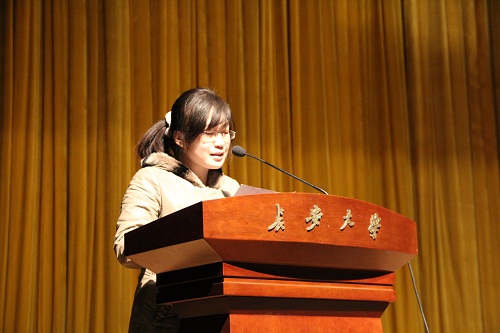 接下来由学生代表杨晓发言,她先由一个故事引出诚信考试的重要性,并随之强调两点:第一、她指出诚信考试是中华民族的传统美德之一,是高尚的力量,道德品质的体现,因此,我们在考试中要继承发扬中华民族的传统美德,以诚信为本。第二、就个人的发展方面而言,考试作弊会滋生不良的心理,在今后的学习生活中会产生不好的效果,再一次强调了诚信的重要性和诚信考试的必要性。最后,杨晓同学代表地测学院全体学生承诺“老实做人,诚信考试”。