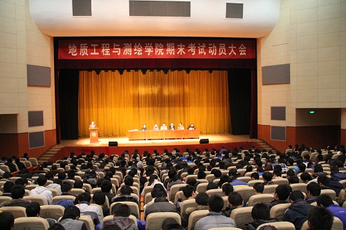 2011年12月25日晚6:00,在长安大学渭水校区朝晖大学生活动中心准时召开了地质工程与测绘学院期末考试动员大会。党委书记杜甫元,院长范文,党委副书记柴琪、滑思忠,副院长李庆春、李同录、隋立春莅临本次大会。本次大会由党委副书记柴琪主持。