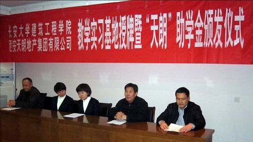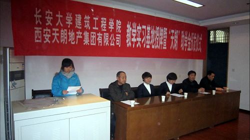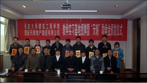 12月30日14时,长安大学建工学院、西安天朗地产集团公司教学实习基地授牌暨“天朗”助学金颁发仪式长安大学建工学院第一会议室隆重举行。出席本次仪式的有天朗地产集团有限公司客户经理裘海逸女士,刊物总编谢王晶女士,建工学院党委书记刘青云老师,院长周天华教授,副书记李武尚老师,副院长吴涛教授,正处级组织员刘世良老师。学生工作办公室、团委、教务部门负责人以及本次获奖学生、学生学生代表40余人也参加了会议。活动由副书记李险峰老师主持。