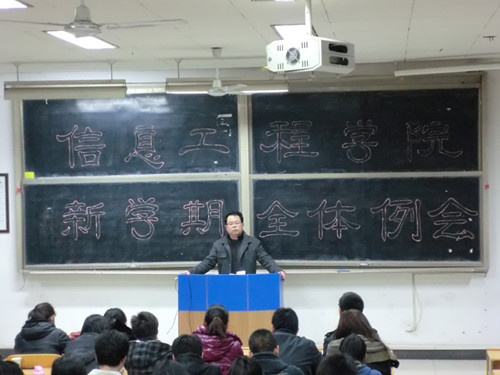 会议伊始,学生会主席李甜甜首先作了重要讲话。他对去年的工作做了详细的总结,并建议学生会的各位同仁在工作时要时时思考,同时主席团和部长们要做好监督工作,且激励大家要敢于接受挑战,勇于拼搏。随后,由团委副书记樊莹对本学期工作进行了计划和安排,点明了本学期学生会的工作重点,要求学生会必须努力、奋进,将本学期的任务圆满完成。接着,她又建设性的提出了几点工作要求,希望我们对工作要有独立性、敏感性,对突发事件要有应对能力。之后,团委书记丁芝娟老师做了详尽补充,提出我们在注重工作时,也要把握学习,同时她也充分肯定了上一学期学生会取得的成绩,并结合自身经验对学生会全体成员提出了要求与希望,又指出我们要吸取教训和学习经验,在这学期把运动会搞好。最后,党委副书记杨玉龙做了总结,他强调我们要加强对学生会的认知,要认识到学生会是一个自我管理、自我服务的群众组织。然后,他对学生会上学期的工作做了肯定的评价,鼓励我们要在大学里要努力、要有收获、要有朝气、要有目标、要会行动。同时,他又点出了团结的巨大力量,要求我们学会团结,并且要进一步的加强实践能力,以此来成为一个有思想、有能力的有为青年。在会议结束时,杨副书记预祝在新的学期中,学生会各项工作能高标准、高质量的完成,为学院的跨越式发展注入活力,为繁荣校园文化建设、协助学院做好学生管理工作。在一片热烈的掌声中,此次会议圆满的落下了帷幕。