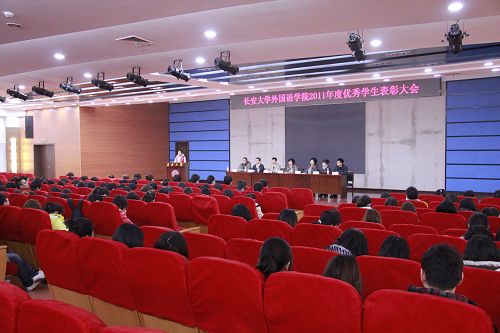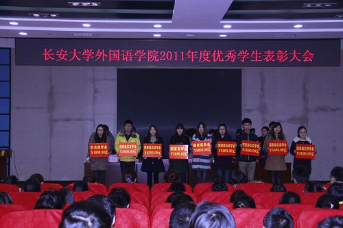 大会在雄壮的国歌声中拉开序幕。首先,路志军副书记回顾了2011年各项工作,他指出:2011年,在学院党委的正确领导下,在各位老师的辛勤培育下,经过全体同学刻苦学习和不懈努力,圆满完成了一年的学习任务,取得了优异成绩。先后有9位同学分别获得了国家奖学金、国家励志奖学金和社会奖学金;40位同学分别获得三好学生标兵等校级荣誉;一个团支部获得“五四”红旗团支部;18位同学获得院级三好学生称号;9位同学参加省级以上学科竞赛并取得优异成绩;全院2011年共有99人(次)同学获得了长安大学校级以上各种奖励,为学院争得了荣誉。随后,刘宇副院长宣读了外语学院表彰2011年度优秀学生名单。接着,伴随着欢快的乐曲,学院为获奖的同学依次颁发奖金、证书,并对获奖同学表示衷心祝贺。之后,获奖代表、国家奖学金获得者王苹同学交流了心得体会。随后,2011级新生代表吴腾梅同学作了发言,她表示要以获奖者为榜样,不断创新、积极进取,使自身学习能力、专业素质、社会实践等综合能力都能有所提高。最后,学院党委书记刘玉敏讲话,刘书记强调:各位获奖同学要以此表彰为起点,再接再厉,面向未来,不断进步,以优异的成绩向党的十八大献礼,并鼓励全院同学树立远大理想,争取早日成为社会主义建设有用和可靠的接班人。