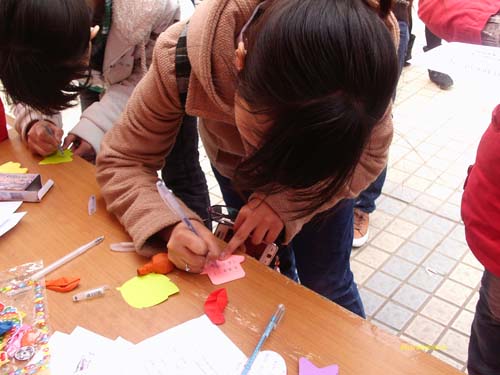 13:00到17:30由专人轮流值班。下午放学,志愿者们又开始了新一轮的志愿活动。志愿者们虽然忙碌了一天,但依旧以最好的状态对待来往的同学,使他们快乐地加入到这个活动中。活动末,愿望板上的气球也被全部扎爆,女生们写的所有的心愿的卡片都被男生们得到,并将实现。最后,所有后勤人员打扫场地,整理物品。18:30,此次活动圆满结束,工作人员合影留念。