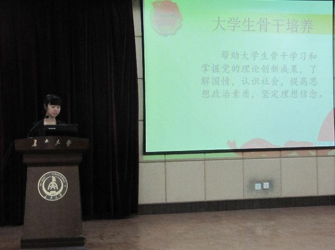 12:30,在一片热烈的掌声中,主持人宣布开学典礼正式开始。首先由上届青马培训优秀学员魏亚玲同学发言。在发言中,她讲述了自己在完成青马培训班课程和活动之后的感想,以及对于青年马克思主义培训活动的理解。她指出,青马培训的目的在于提高广大青年大学生的思想觉悟和政治素质,用马克思主义来武装自己的头脑;重点的培养对象则是大学生骨干、共青团骨干以及广大的青年知识分子。她还回顾了在往届青马培训中进行的校史讲座、青马辩论赛和火车站志愿者等活动。最后,她向新学员们讲述了青马培训班的奖励表彰制度,鼓励大家积极学习、争取进步。随后,新生代表赵烁同学也进行了发言。作为2012年度新学员的代表,他号召大家对自己加强要求,认真学习青马培训课程、积极参加相关活动,通过学习马克思主义思想来提升自己的修养和认识。