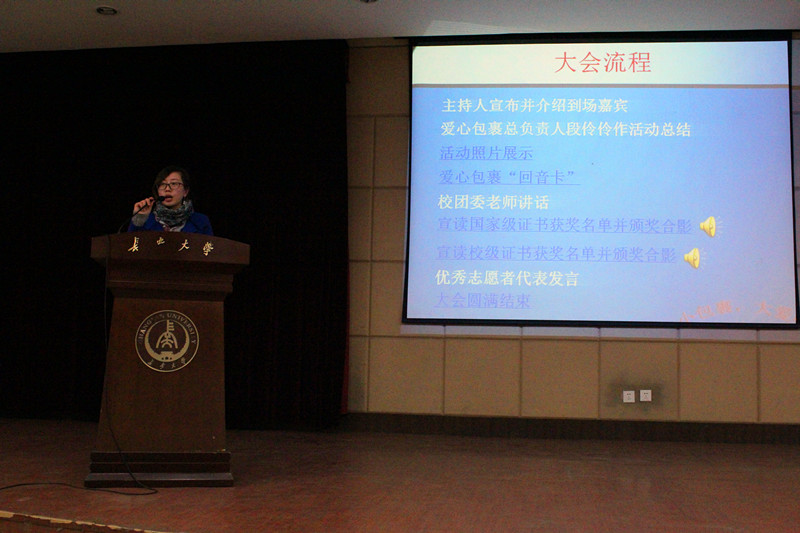 晚7:00,大会在一段“爱心包裹劝募志愿者项目宣传片”中拉开了帷幕,本次活动总负责人段伶伶为大家展示了本次活动的成果,并就本次活动作了总结。接着,主持人为大家展示了收到爱心包裹的的孩子们所写的回音卡和感谢信。随后,本次劝募志愿者项目社长汤茂森宣读了国家级证书获奖名单和校级证书获奖名单,并对他们致以衷心的祝贺。获奖志愿者代表们相继走上台,由校团委李瑾老师和工程机械学院院团委谢静老师为国家级证书获奖者代表颁奖并进行合影。工程机械学院2010级辅导员王博老师为校级证书获奖者代表颁奖并合影。之后,本次爱心包裹劝募志愿者项目代表、国家级证书获得者代表王会莉进行了发言,她讲述了一些发自肺腑的感受,也总结了自己在本次活动中的体会和收获。最后,校团委李瑾老师对本次劝募志愿者活动的相关工作做了总结,并就此次活动所取得的优秀成绩给予高度的肯定,同时提出了宝贵的意见,为我院青年志愿者服务队今后的发展方向给予指导性建议。