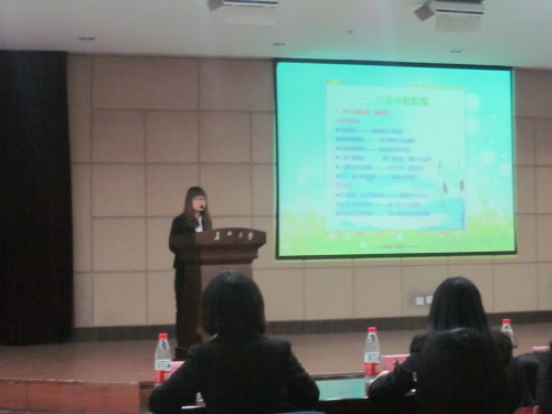 我院学生会副主席杨素华结合精美的电子杂志向各位评委和观众展示了一个不一样的外国语学院。整个发言围绕我院学生会的指导思想展开,即“立足小院院情,抓住外语优势,创新活动载体,服务广大同学”,重点讲述了一年来我院学生会各项工作的开展情况以及回顾各项活动所获得的经验和教训。特别值得注意的是“创新活动载体”这一部分,其中最重要的是我院成功推出的一系列志愿活动,如雷锋月、学习雷锋活动、支教活动及地铁志愿服务活动等,充分展示了我们志愿者的风采,同时对于学生会成员思想的引领和价值观的确立具有积极的影响。3分钟的个人发言结束后,面对评委的提问,杨素华副主席的精彩答辩赢得了一致好评,最终在整个评审中获得优异成绩。