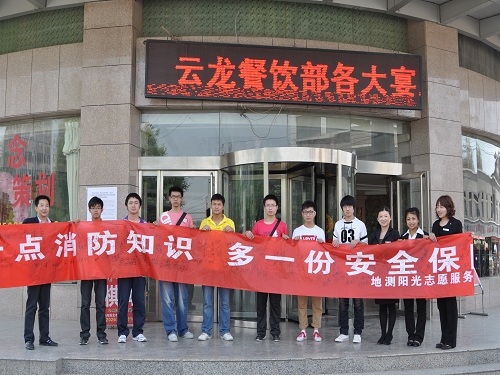 2012年4月21日,为了深刻吸取事故教训,进一步增强公民消防安全意识,地测学院阳光志愿服务团进行“防消结合,谨记在心”酒店消防知识宣传活动。