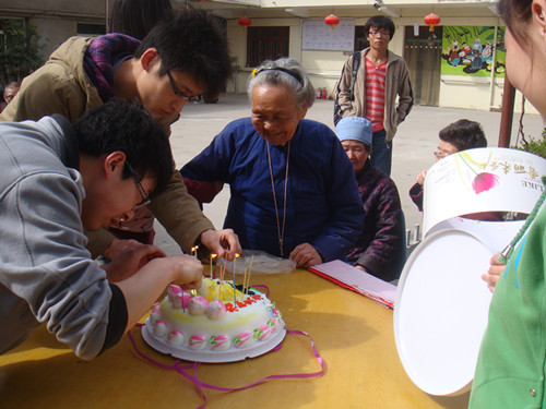 见到志愿者的到来,老人们热烈欢迎。随后,志愿者们开始忙碌起来,有的帮助管理员打扫卫生,有的主动与老人亲切交谈,有的给老人表演节目,老人们脸上充满了甜蜜的微笑。接着,大家陪老人们剪花纸、放风筝、打太极,和老人一起唱红歌,回忆他们的年轻时光。一位83岁的老军人,每当听完我们合唱《学习雷锋好榜样》后,都会充满激情地鼓掌并大声的说一声“好!”,他的革命精神深深感动打动了我们。聊天中,得知今天是一位老奶奶的95岁生日,我们买来生日蛋糕为她庆祝,所有人围在一起为老奶奶唱生日歌,一起为她祝福,老奶奶感动的热泪盈眶。最后,所有志愿者与老人合影留念。当我们将要返校时,他们用慈祥期盼的眼神看着我们,大家依依不舍地离开。
