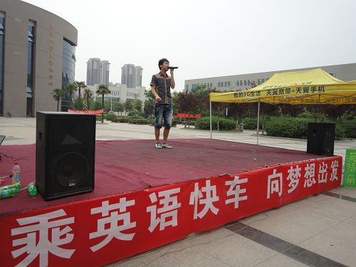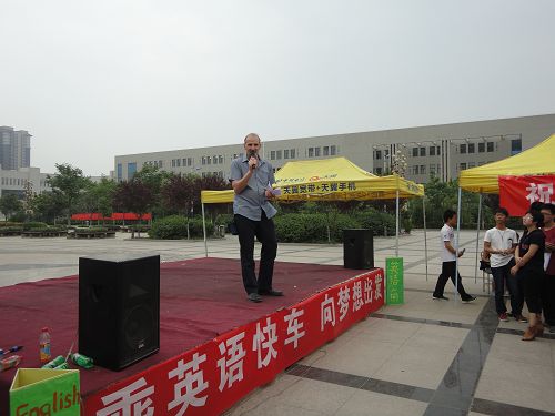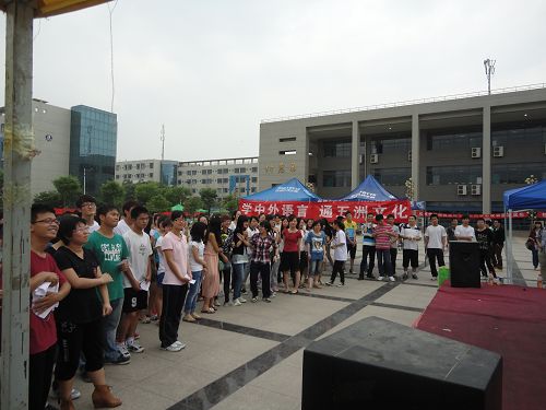 2012年5月6日下午四点,外语学院在朝晖大学生活动中心外广场举办长安大学2012年英语角外场,参加此次活动的有英语系外教Harrison、外语学院团委书记宁育国,以及来自材料、经管、信息、外语等七个学院同学及留学生代表。
