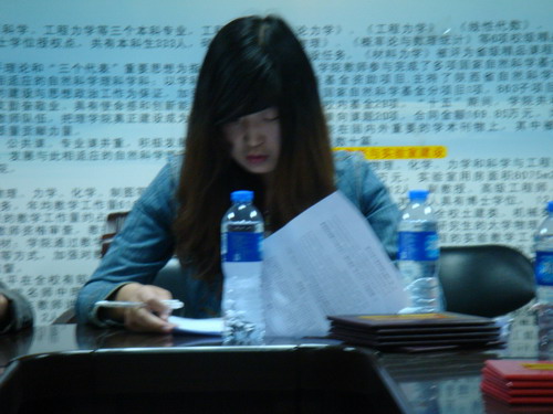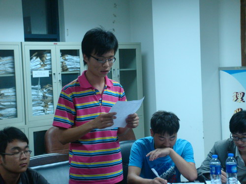 7:00,会议正式开始。汤老师首先对本次换届工作做了思想指导,肯定了科协一年来的工作成绩,对大家工作效率高、重视宣传的积极表现提出表扬,并对科协以后的发展提出了几点要求和建议,为科协成员以后的工作指明了方向。会议第二项由王敏主席对科协本学年的工作做了汇报总结。她主要从我院科协一年来举办的各项活动进行了分析,指出了活动中的优点与不足,对科协的未来提出了几点希望。接下来,谭明忠同学对我院科协在校科协的表现做了总结,他对我院科协在校科协组织的活动中的表现作出表扬,指出我们应将自己的精品活动做到更好。会议第四项是2012年换届工作,本次换届活动的评审团由王敏、谭明忠、朗亮明、金平江、陈振九名委员组成,竞选职位有主席团及各部部长。竞选分为三分钟竞选演讲和两分钟评委提问。各位应试者分别从自己一年的工作收获以及对未来的工作规划方面进行了精彩的陈述,评委提问新颖,切合我院实际,考察了竞选委员的随机应变能力,并对应试者的回答做了简短点评,会场气氛热烈又不失严肃。会议第五项是颁发先进个人荣誉证书及主席部长聘书。最后,由主席对下届科协寄语,会议结束。
