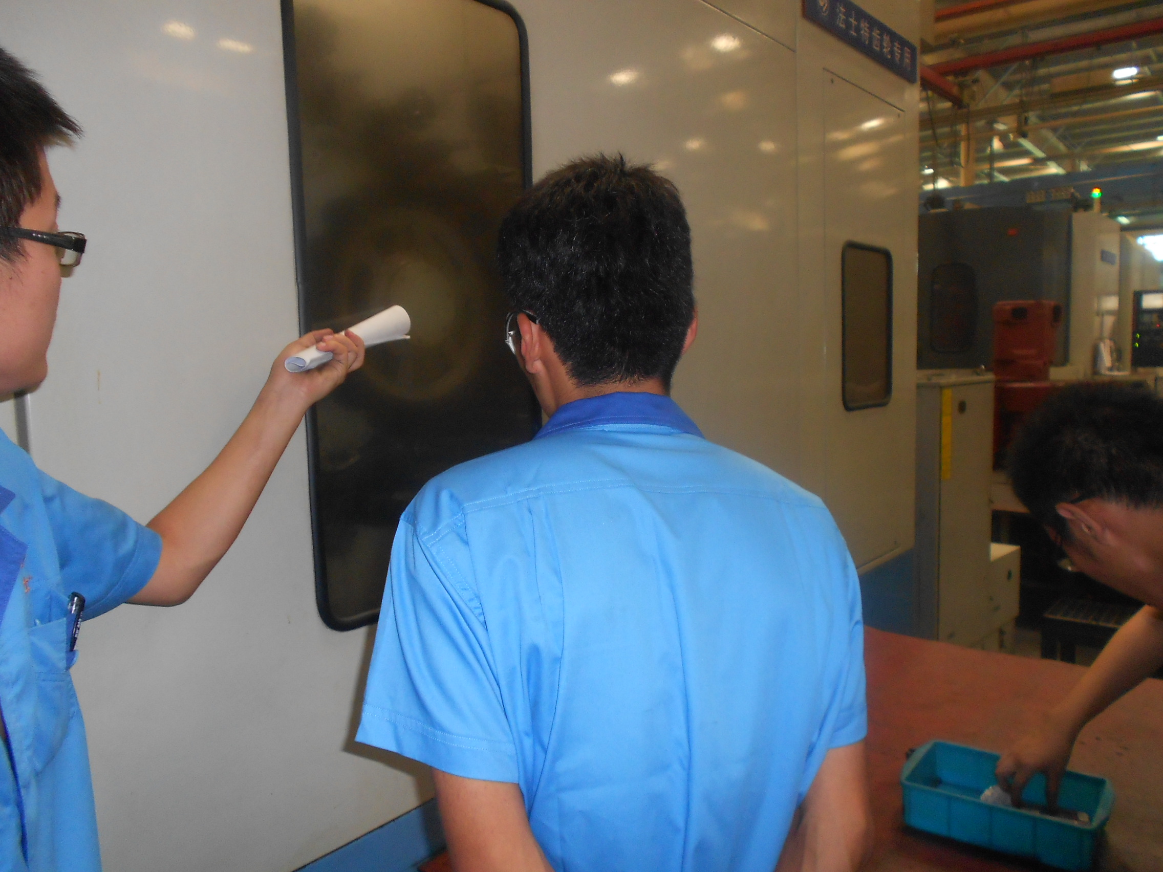 大清早,实践队全体队员就来到了法士特加工车间。上午的主要对变速箱壳体的加工进行了实习。首先加工一线的技术人员为队员们进行了详细的加工原理介绍,主要是讲解变速箱的加工要求,以及在其表面进行螺纹开孔的方法等。让队员对其有了初步的认识,在技工师傅的带领下,实践队伍来到了加工前线。在前线的学习中,认识到变速箱壳体的加工并不像变速箱的装配一样进行流水线加工,而是采用在一台机床中一次性加工的方法来完成。并且在加工冷却液的浇灌下进行湿加工,钻出相应的螺纹孔。当一个大壳加工完成后,再进行的是对成品的检验。