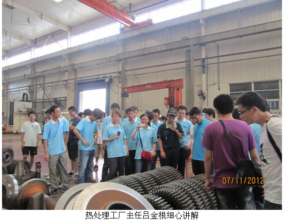 13:30,我实践队开始了推土机事业部各工厂的实地参观活动。在制齿工厂,主人乔锟向我们详细介绍了工厂的各种先进的数控机床及各型号齿轮产品的功能与制造工艺。在热处理工厂,主人吕金根详细向我们介绍了热处理的各种先进设备、工作原理及热处理在热处理在提高工件表面硬度,耐磨性,延长使用寿命方面的重要功能。在金结工厂,技术员董云龙带领我们参观了先进的焊接机器人及其各工件的焊接定型过程。在金加工工厂,技术员冯淑英带领我们参观了推土机后桥箱,机架,台车及外壳体的生产加工过程。在总装工厂,主任薛媛媛带领我们参观了推土机的装配生产线。在厂内,我们目睹了一个个零散的工件由装备工人一步步地组装成一台台完整的推土机。在参观推土机事业部工厂的过程中,我们不仅认识到了山推各种先进的制造装配设备与技术,更看到了山推人认真负责,刻苦学习,爱岗敬业,爱厂荣厂的精神。我们有理由相信,拥有如此优秀的团队,山推“打造全球领先,拥有核心技术,可持续发展的世界级制造装配集团”目标的实现当在不远。