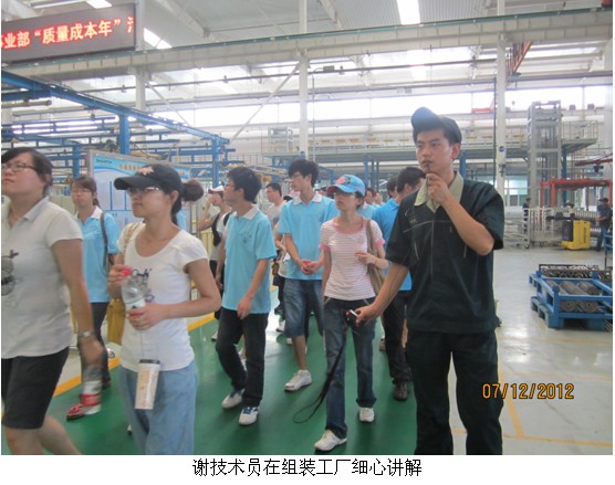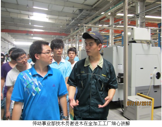 13:30,谢技术员带领我们参观了传动事业部装配工厂。谢老师介绍,装配工厂共有七条装配生产线,厂内设备自动化水平达到百分之七十以上。工厂与徐工,临工,柳工,厦工及斗山等工程机械制造厂商密切合作,在研发,生产,装配等领域取得了长足发展。接着,谢老师带领我们参观了工厂生产的各类型变速箱及其传动设备,参观过程中,谢老师悉心解答同学们所提的各项问题,极大丰富了我们的实践经验。