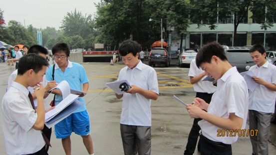 2012年7月8日,早上一起来,发现窗外已经下起了大雨。但是经过商量,我们还是决定按计划出发,向中国西安人才市场出发。在地铁上,我们的着装引来了许多人的目光,其中几个人问我们是干吗的,我们很自信的对他们说我们是长安大学暑期社会实践队,正在做“蚁族”价值取向与心理现状的调研。他们对我们的活动给予了很大的肯定,我们也更坚信自己能把这次社会实践活动做好。