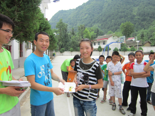 12日上午9:00,随着支教队裁判代表一声令下,趣味运动会在趣味项目“绑腿跑”中拉开序幕。同学们你追我赶,上演了一场精彩的趣味竞争场面,同时让学生们明白团队协作的重要性;接下来的“运乒乓球”比赛更是让赛场的气氛持续升温……最后的“松鼠大树”游戏则在轻松的氛围下将正常运动会推向高潮。在趣味运动会中,不仅有学生之间的相互比赛竞争,还有支教队同学们的参与,体现了短短几天内培养出的师生之间的默契和亲厚。运动会的最后,由队长刘仁义为比赛获胜者颁发了奖品。